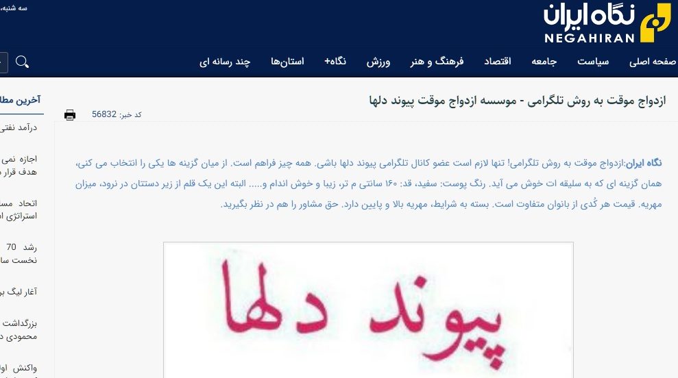 نگاه ایران: ازدواج موقت به روش تلگرامی! تنها لازم است عضو کانال تلگرامی پیوند دلها باشی. همه چیز فراهم است. از میان گزینه ها یکی را انتخاب می کنی، همان گزینه ای که به سلیقه ات خوش می آید. رنگ پوست: سفید، قد: ۱۶۰ سانتی م تر، زیبا و خوش اندام و….. البته این یک قلم از زیر دستتان در نرود، میزان مهریه. قیمت هر کُدی از بانوان متفاوت است. مهریه طبق درخواست خانم و شرایط ایشان تنظیم میشود.